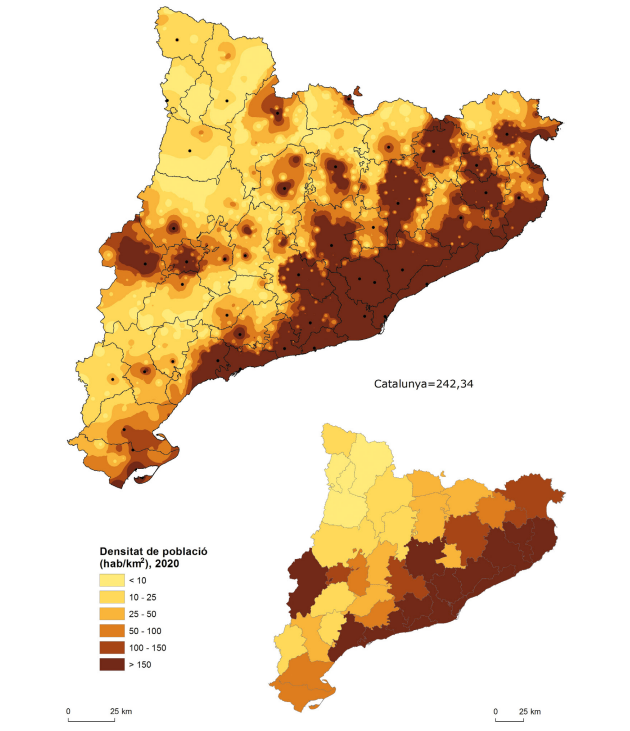 La intensitat de la presència humana, mesurada en termes de densitat demogràfica, és la referència més contundent de la ruralitat, per les conseqüències socials i econòmiques que implica aquesta baixa densitat demogràfica; relació directa amb l’entorn no edificat, baixa capacitat per retenir serveis privats i públics, atreure noves activitats, mantenir una sociabilització més o menys rica… El mapa posa en evidència alguns espais quasi desèrtics dels Pirineus i algunes muntanyes interiors, que no arriben als 5 habitants per km2, al costat d’alguns àmbits meridionals també poc habitats, i en contrast amb les densitats de la línia de costa i els municipis metropolitans, que superen sovint els 1.000 habitants per km2 . La densitat és inferior a 10 hab/km2 en 208 municipis. Els coneixedors més fins de la realitat municipal trobaran les distorsions que implica el fet que la densitat relacioni la població empadronada d’un municipi amb la superfície del seu terme municipal. Ciutats i viles amb un terme gran com Tremp es dilueixen en la baixa densitat rural, al contrari, per exemple, de Sant Llorenç de Morunys, amb un terme municipal minúscul. Font: Padró municipal d’habitants 2020, Idescat.