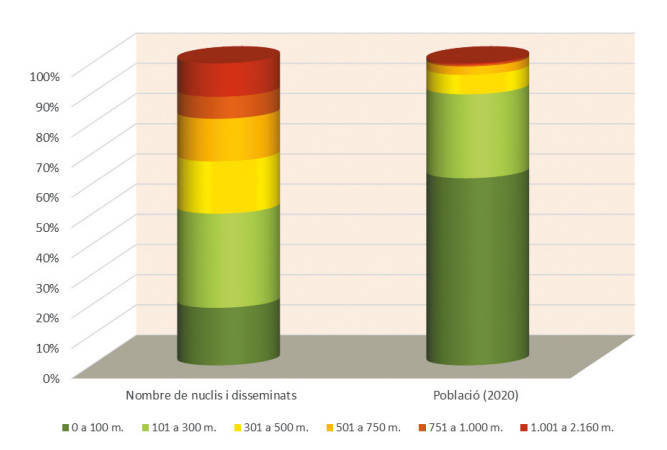 L’altitud té una incidència directa sobre la implantació de la població i la definició de la ruralitat. En el gràfic podem veure una certa homogeneïtat en la distribució dels assentaments segons l’alçada, amb un 19% dels nuclis i disseminats amb alçades entre 0 i 100 metres, un 31% entre 101 i 300 metres, un 17% entre 301 i 500 metres, un 14% entre 501 i 750 metres, un 7% entre 751 i 1.000 metres i un 11% per sobre dels 1.000 metres d’alçada. Però la població es troba concentrada sobre el litoral i les àrees properes. Els municipis de fins a 100 metres d’alçada concentren el 62% de la població del país. Si hi sumem el 28% que viu entre 101 i 300 metres, trobem que 9 de cada 10 catalans viuen per sota dels 300 metres d’alçada. De fet, només l’1% dels catalans viu per sobre dels 750 metres d’alçada, malgrat trobar-hi un bon nombre d’assentaments. Font: Elaboració pròpia a partir de dades del Nomenclàtor 2020, INE.