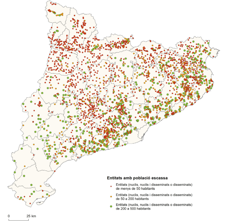 En analitzar més en detall les entitats de població destaca la petitesa demogràfica de moltes d’aquestes unitats que es tradueix en una limitació important a l’hora de disposar de serveis i mantenir un dinamisme social i econòmic satisfactori. Un gran nombre d’entitats no arriba als 50 habitants, un mínim demogràfic que tradicionalment s’ha considerat un llindar per a no caure en una espiral de desintegració de la comunitat rural i de despoblament. Mentre les comunitats situades entre 50 i 200 habitants es troben en una millor situació, però es veuen generalment afectades, com es veurà, per la manca de serveis bàsics com pot ser una escola, l’atenció mèdica o un equipament públic bàsic, a banda de la manca de serveis privats. Unes problemàtiques que s’estenen també cap als assentaments d’entre 200 i 500 habitants. Tret de les comarques costaneres i l’entorn metropolità, on aquests petits assentaments s’associen a urbanitzacions desenvolupades en els darrers seixanta anys, les limitacions esmentades apareixen en una gran quantitat de pobles i grups de masies característics dels Pirineus i les comarques centrals. Font: Elaboració pròpia a partir de dades del Nomenclàtor 2020, INE.
