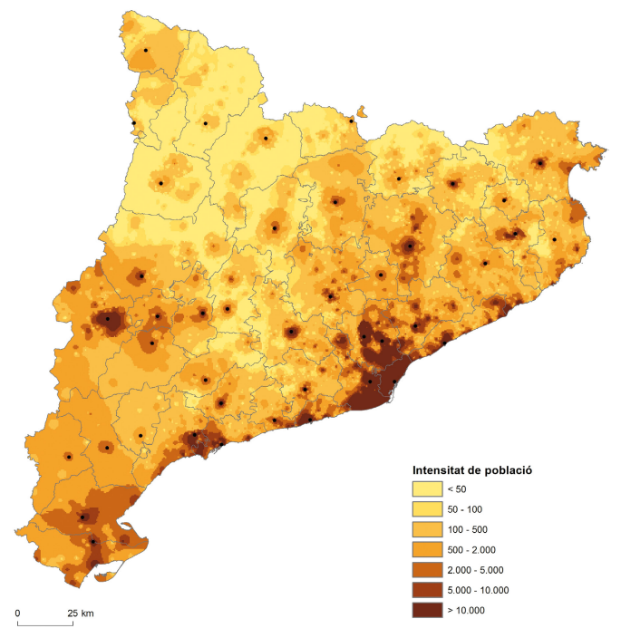 A partir de l’efecte taca del nombre d’habitants dels assentaments es confirma i precisa la concentració humana en unes poques àrees; l’entorn metropolità de Barcelona i les seves extensions per la costa i els eixos de penetració cap a la Catalunya Central i planes de Lleida. En contrast, una bona part del país presenta una intensitat clarament inferior que es redueix cap als Pirineus i àrees centrals en consonància amb la presència de molts assentaments que no arriben als 50 habitants. La intensitat del poblament associada al volum demogràfic serveix per explorar el fet que la dimensió socioeconòmica de la ruralitat no solament té a veure amb la magnitud del propi assentament (representada en base a la dada força fiable de la població empadronada), sinó també amb la proximitat d’un assentament important que pot facilitar llocs de treball i serveis. Com veurem més endavant, la proximitat a centres urbans relativitza els inconvenients de viure en una masia o en una petita població, i l’estructura urbana de Catalunya tempera, en aquest sentit, els inconvenients de l’aïllament. Però, naturalment, hi ha contrastos importants entre la proximitat a una àrea metropolitana o una capital regional, o la proximitat a una petita centralitat rural. Font: Elaboració pròpia a partir de dades del Nomenclàtor 2020, INE. (*) A partir de la localització de les diferents entitats de població i tenint en compte la seva població s’ha calculat la intensitat de poblament a partir d’una interpolació de les dades en un ràster IDW.
