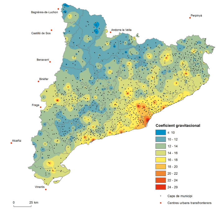 La dimensió geogràfica real dels assentaments humans i les seves relacions se’ns posa de manifest a partir del moviment de la població per la xarxa viària. A través d’un coeficient gravitacional calculat per als caps de municipi se’ns mostra com s’organitza el territori de Catalunya a partir d’un àmbit metropolità que s’estén per la costa i els eixos viaris més importants. El mapa completa la idea d’incidència de la proximitat urbana en la caracterització rural que s’expressava en el mapa anterior. En aquest cas, la combinació de la distància en temps entre els caps de municipi, combinada amb el pes demogràfic destaca la profunditat urbana dels diferents territoris. El treball a l’escala municipal perd la precisió topològica de l’entitat de població del mapa anterior, encara que ajuda a fer més palès el contrast entre la metròpoli i la gran regió urbana costanera amb el rerepaís rural. Remarca, alhora, la “profunditat o buit rural” de determinades contrades pirinenques i dels altiplans interiors. Font: elaboració pròpia a partir de dades de temps de viatge entre els caps de municipi de Catalunya respecte les capitals comarcals i altres centres urbans propers, extretes del portal de mobilitat de la Generalitat de Catalunya (http://mobilitat.gencat.cat) i de dades de població municipal i comarcal d’Idescat. (*) El coeficient es calcula multiplicant la població d’origen (municipal) per la població de destí (població de les capitals comarcals o centres urbans transfronterers). Aquest resultat es divideix per la distància del cap de municipi amb cada capital elevada al quadrat per arribar a un coeficient gravitacional. Per a la representació gràfica es calcula el logaritme neperià de la dada resultan
