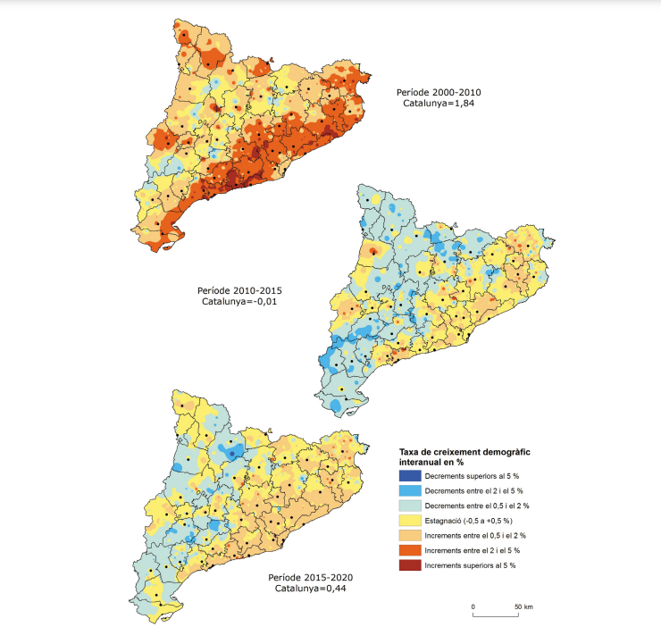 El mapa 2.1 ens dibuixa clarament un escenari de crisi demogràfica, en el període que va seguir el boom immobiliari i migratori dels primers anys del segle XXI. El ritme de creixement força generalitzat experimentat fins al 2008 s’atura de cop i la major part dels municipis catalans, 500, passen a perdre població. Reapareix una ruptura est-oest en l’àmbit català, amb una meitat oriental on predominen encara els creixements moderats de població, mentre que a les comarques pirinenques, a les Terres de l’Ebre i en bona part dels municipis d’interior predominen les pèrdues entre moderades i altes. La recuperació econòmica del quinquenni previ a la crisi sanitària del 2020 no es tradueix tampoc en una recuperació demogràfica prou generalitzada territorialment. Trobem, aquí també, excepcions en les centralitats urbanes i alguns municipis que les envolten, així com entorns tradicionalment més dinàmics com la Vall d’Aran i la Cerdanya. Font: elaboració pròpia a partir del Padró municipal d’habitants, Idescat.