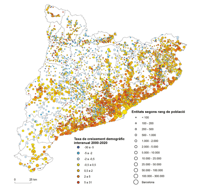 Malgrat les limitacions metodològiques de la font estadística, el mapa de volum demogràfic i creixement de les entitats de població té la virtut d’apropar-nos més a la implantació real de la població en el territori. S’hi detecta l’estructuració urbana del territori en aglomeracions humanes a l’entorn de l’àrea metropolitana de Barcelona i les ciutats principals, que en general presenten dinàmiques de creixement positives en el període analitzat, del 2000 al 2020. Aquestes aglomeracions es fan menys denses i més reduïdes a mesura més ens allunyem de la costa i de Barcelona. Es dibuixen aleshores corredors urbans que prenen un paper importantíssim en el desenvolupament de les àrees rurals del país. Des de corredors històrics com l’eix del Llobregat, l’eix del Ter-Congost o el del Fluvià, que tenen un comportament demogràfic diferenciat, amb problemes en l’eix del Llobregat, fins a eixos històrics interiors lligats a fenòmens recents més dinàmics, com el de l’N-II, que es perllonga cap al Baix Segre, al costat d’altres eixos que han quedat més aviat en la marginalitat històrica, com els del Corb o el Sió. Per no parlar de la franja habitada que es dibuixa entre Puigcerdà i el Pont de Suert, dinàmica a l’est i completament regressiva a l’oest. Font: elaboració pròpia a partir del Nomenclàtor 2000 i 2020, Idescat.