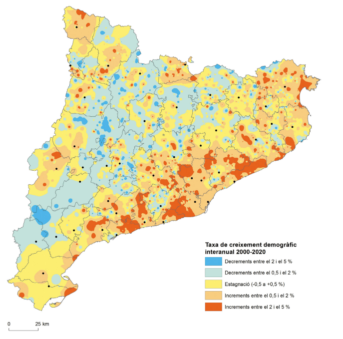 Els moviments demogràfics segueixen amb un cert retard els cicles econòmics, fet que es comprova en analitzar l’evolució dels saldos migratoris, variable que a hores d’ara alimenta la part substancial del creixement demogràfic, a banda de rejovenir la piràmide demogràfica i estimular el creixement vegetatiu amb la incorporació de població jove nouvinguda. Abans de la crisi del 2008 ja es notava una desacceleració en el fort creixement immigratori dels primers anys de la centúria. Després, es passarà a un creixement migratori negatiu, amb més sortides que entrades, que es reverteix el 2015 per al conjunt de Catalunya i arriba més tard i de forma més moderada a l’interior del país. Com si volguessin recuperar el temps perdut, les regions o vegueries interiors experimenten, en canvi, un repunt migratori favorable extraordinari l’any 2018, just poc abans que la crisi sanitària tornés a posar els moviments migratoris entre parèntesis. Font: elaboració pròpia a partir d’Idescat, índexs corresponents.