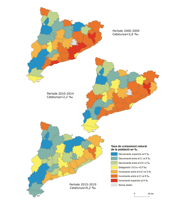 Al costat del saldo migratori, el creixement natural de la població és l’altra variable determinant del creixement general de la població. Les taxes de creixement natural o vegetatiu no varien tant d’un cicle demogràfic a un altre, i estan força relacionades amb l’arribada de població immigrada jove que estimula els naixements, més que no pas amb diferències locals en els comportaments reproductius. En aquest context, les comarques interiors més recessives i de menor immigració presentaran també taxes de creixement demogràfic natural inferiors. Font: elaboració pròpia a partir de dades d’Idescat. La taxa bruta de creixement natural és el resultat del quocient entre el saldo natural, expressat com a diferència entre el nombre de naixements i el nombre de defuncions registrats en un any determinat i la població a meitat del període. S’expressa en tant per mil i les dades són les mitjanes anuals de cada període. (*) Les dades de la comarca de nova creació del Moianès (que figura en gris en alguns mapes) es reparteixen entre les comarques d’adscripció anterior dels seus municipis en les dates anteriors a la seva creació.