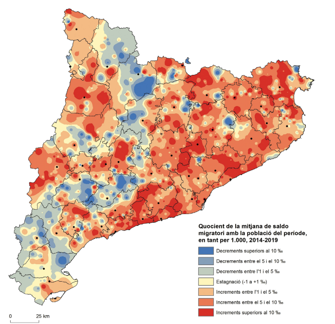En la recuperació de la immigració dels darrers anys no s’assoleixen les xifres de principi de centúria, i alguns municipis rurals no reben immigrants o senzillament presenten un saldo migratori negatiu. Tot i la gran dispersió de casuístiques que es poden donar en l’escala municipal, podem apreciar que els creixements migratoris més importants s’han donat en municipis costaners, en els ubicats en els principals eixos viaris i en els municipis residencials ubicats prop de grans centres urbans. Per contra, entre els més de 300 municipis amb saldo migratori negatiu, trobem una certa concentració en la zona occidental, en una dorsal que va de les Terres de l’Ebre fins al Pirineu passant pels municipis ubicats en el límit de les demarcacions de Lleida i Tarragona, i la zona del Segre Mitjà. Font: elaboració pròpia a partir de l’Estadística de variacions residencials, Idescat.