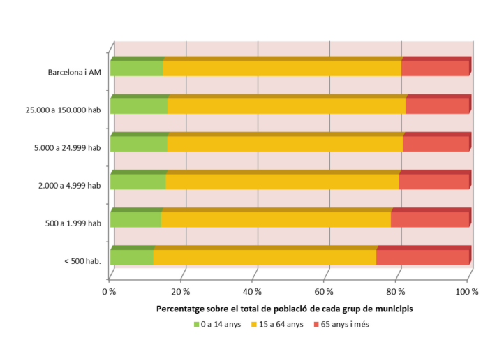 En la mesura que els municipis petits presenten una menor dinàmica demogràfica que es perllonga en el temps, l’estructura d’edats de la seva població presentarà també un nivell d’envelliment inexorable. S’aprecia clarament en la variació del pes dels grans grups d’edat en funció de la dimensió poblacional del municipi. Els municipis menys poblats presenten més pes de la població de 65 anys i més, que supera el 25 % del total, i un pes menor de la població de 0 a 14 anys, que baixa fins a quasi el 5 %. El grau d’envelliment dels municipis petits es troba a la base d’una dinàmica de reproducció o reposició demogràfica també negativa i té repercussions tant a l’hora de determinar la renda i les necessitats d’aquestes àrees rurals, com en el seu dinamisme econòmic i social. Font: elaboració pròpia a partir de dades padronals, Idescat.