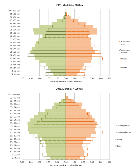 En les piràmides del 2001 s’observa, en tots dos segments de municipis, una forta acumulació de població masculina i femenina en les generacions de més de 65 anys, ben destacable en el context de Catalunya. Aquesta concentració, que desapareix en els darrers vint anys, seria a la base també de la pèrdua demogràfica inercial dels petits municipis en els darrers vint anys, i permet imaginar una evolució del creixement natural millor en els propers anys, tot i que la piràmide dels municipis petits continua presentant-se notablement envellida, i les generacions en edat de procrear, notablement minvades. De les piràmides també destaca la manca de generacions d’entre 45 i 65 anys a principi de la centúria, relacionada amb la baixa natalitat i l’emigració. També cal destacar que la baixa natalitat dels darrers anys ha conformat unes generacions joves molt reduïdes en nombre d’efectius, amb més incidència del fenomen com menor és el municipi. Les dades del 2020 mostren encara piràmides envellides, però lleugerament rejovenides en relació amb les precedents. En edats mitjanes, entre 40 i 60 anys, i sobretot entre els homes, es nota el fort impacte de la immigració estrangera, majoritàriament masculina, de principis de segle XXI, i, a la vegada, una certa recuperació de la natalitat gràcies a la població immigrada, tot i que encara és insuficient per frenar el procés d’envelliment de la població. A la vegada, aquests contingents majoritaris ja s’apropen a l’edat de jubilació. Font: elaboració pròpia a partir de dades padronals, Idescat.