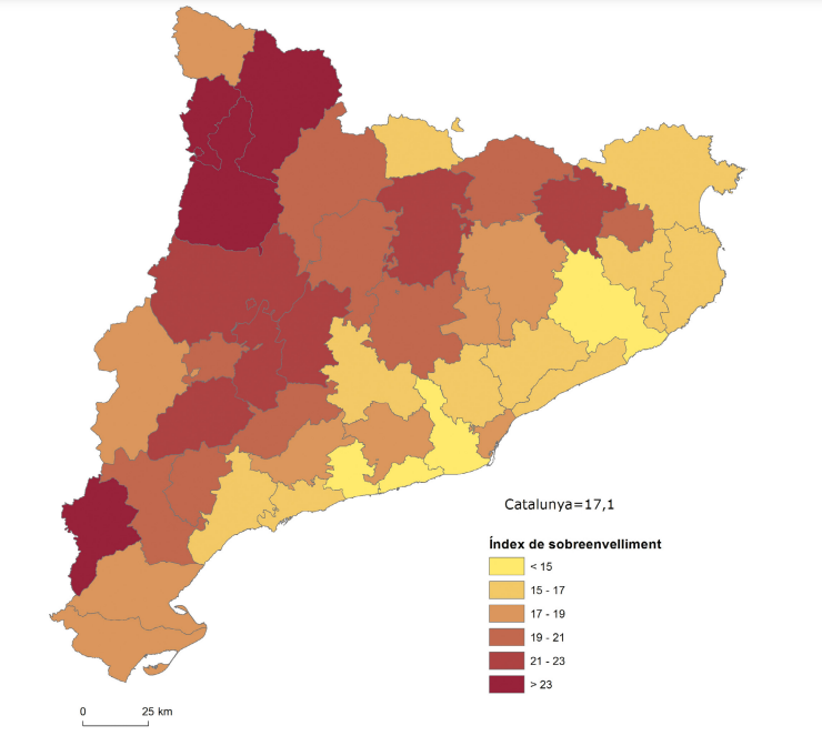 Les comarques interiors no solament presenten una proporció superior de persones de la tercera edat, sinó que dins d’aquest grup d’edat destaquen pel grau de sobreenvelliment. És una circumstància que es podria relacionar amb la major esperança de vida de les comarques interiors, però que més aviat té a veure amb els gruixos generacionals i amb la preexistència d’un envelliment tant o més remarcable en aquestes comarques ara farà vint anys o més. El sobreenvelliment remarca l’augment de la problemàtica relacionada amb l’atenció a la gent gran afectada, amb l’edat, per problemes de dependència, i la dificultat de satisfer les necessitats i trobar atenció als pobles petits. Font: Padró municipal d’habitants, Idescat. (*) El resultat és producte del càlcul de la població de 85 anys i més per cada 100 habitants de 65 anys i més.