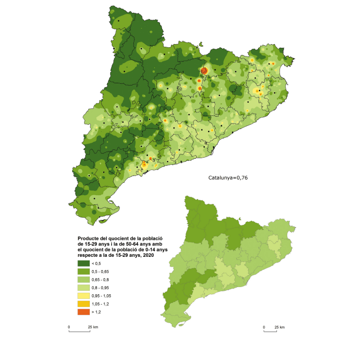 En el conjunt de Catalunya, aquest indicador se situa per sota d’1 (0,76), fet que determina una disminució irreversible de població en edat de treballar i una tendència cap a la pèrdua de població. Els escassos municipis amb dades positives es troben en creixements residencials recents per descongestió de ciutats del voltant de Tarragona, Girona i Lleida, a la conca d’Òdena, el sud-est del Berguedà i casos particulars com, de nou, el de Guissona, entre d’altres. Els municipis amb indicadors més baixos de potencial s’ubiquen en zones perifèriques, que comprenen els altiplans de la zona limítrofa entre les demarcacions de Lleida i Tarragona, i una àmplia franja prepirinenca que es perllonga fins al nord del Ripollès i s’estén també cap al Pallars Sobirà i una petita part de l’Aran. D’alguna manera, es compleixen les inèrcies derivades de l’èxode rural de dècades anteriors, que configuren una situació demogràfica precària. Font: elaboració a partir de les dades d’estructura de la població per sexe i edat quinquennal del Padró municipal d’habitants, Idescat. S’obté pel producte de dos quocients, el que es produeix entre la població de 15 a 29 anys respecte a la de 50 a 64 anys, i la de 0 a 14 anys respecte a la de 15 a 29 anys.