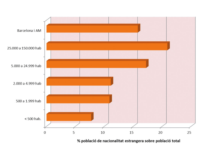 L’arribada de població estrangera juga un paper destacat en l’explicació dels saldos migratoris, i això val també per als municipis rurals, tot i que s’aprecia un gradient de població estrangera en funció de la dimensió poblacional del municipi. Els municipis de menys de 500 habitants se situen de mitjana en un 7,7 % de població estrangera. Entre 500 i 5.000 habitants, el percentatge ascendeix al voltant de l’11 %. En els municipis urbans, el percentatge supera el 15 %, especialment en les ciutats intermèdies, on la xifra puja per sobre del 20 %. El percentatge de població estrangera baixa una mica a la zona metropolitana, especialment pel que fa a les zones residencials perifèriques d’aquesta, però no pas així al seu nucli central, on Barcelona compta amb un 21,6 % d’estrangers. Font: elaboració pròpia a partir del Padró municipal d’habitants, Idescat. (*) No cal recordar que la població d’origen estranger comptabilitza les persones que mantenen la nacionalitat d’origen i no inclou els nacionalitzats espanyols, tant els pares com els fills.