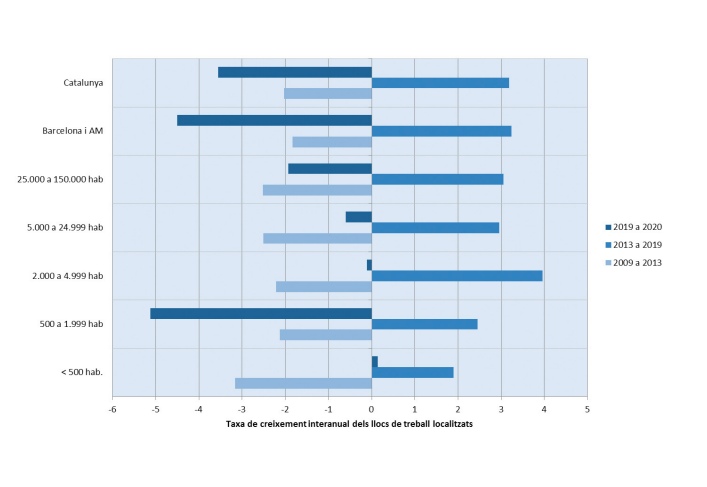 Al contrari que en la crisi de la bombolla immobiliària, en els primers mesos de la crisi de la COVID-19 el segment de municipis que millor va suportar la crisi van ser els municipis petits, fet que tindria a veure amb la major resistència del sector primari i els treballadors autònoms, sectors destacats en aquests municipis. Tot i amb això, la Catalunya rural no ha escapat de l’impacte, molt fort en municipis de 500 a 1.999 habitants. Font: elaboració pròpia a partir de l’Estadística de l’ocupació assalariada i autònoma segons afiliacions a la Seguretat Social, a darrer dia del mes de desembre, menys pel 2020, que, per manca de més dades, s’empren dades del darrer dia de setembre. S’han seleccionat les dades en funció dels cicles de creixement trimestral (gràfic 2.2). Les dades municipals inclouen tant treballadors assalariats com autònoms. (*) La sèrie Estadística de l’ocupació assalariada i autònoma segons afiliació a la Seguretat Social de 2021 ha quedat paralitzada en els resultats del 30 de setembre de 2020 i obliga a comparar dades de mesos diferents, fet que genera biaixos en el sector agrari i els derivats del turisme de neu.