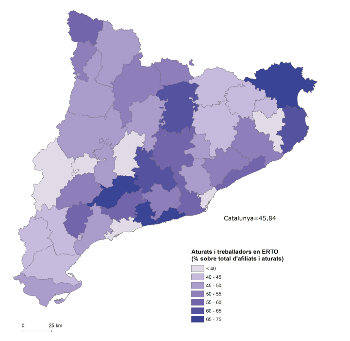 Apreciem aquí que l’impacte de les pèrdues o la precarització en el mercat laboral ha estat més fort en les comarques litorals i prelitorals, de l’àrea metropolitana, i en zones interiors amb un fort component industrial (Conca de Barberà, Berguedà). A les zones rurals, de manera majoritària, les dades d’incidència de la precarització laboral es troben per sota de la mitjana catalana. Tanmateix, a banda de les dues excepcions anteriorment assenyalades, cal notar també la relativament forta incidència a les comarques de l’Alt Pirineu i Aran, més vinculades amb l’activitat turística. Font: elaboració pròpia a partir de les dades d’atur registrat en valors absoluts (dades mitjanes de 2020) i les dades d’ERTO per comarca també en valors absoluts. (*) S’ha calculat el percentatge de la suma d’aturats i persones en ERTO el 2020 en relació amb el total d’afiliats més el total d’aturats, per copsar la incidència de la precarització laboral en les diferents zones del país.