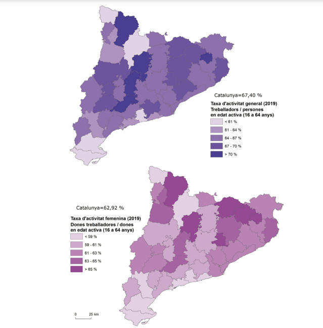 La diferència convencional que assenyalava les comarques rurals com les menys implicades en l’ocupació, degut en bona part al fet que moltes mestresses de casa no s’incorporaven al mercat laboral, s’ha esfumat amb els anys. Al contrari, hi ha una diagonal de comarques interiors rurals que presenta les taxes més elevades d’activitat. Quedarien, amb tot, algunes comarques interiors amb un nivell d’activitat encara força baix. Les diferències intercomarcals de l’ocupació tenen molt a veure amb la inserció de la dona en el mercat laboral, com es comprova en comparar la presència específica de dones en edat de treballar amb les taxes d’activitat del conjunt. Les comarques amb menor presència de dones en el mercat laboral es corresponen amb les que tenen també una taxa d’activitat més baixa, i entre aquestes comarques en trobem algunes de rurals, que no arriben a constituir un tret específic. Font: Afiliacions a la Seguretat Social segons residència padronal de l’afiliat. A últim dia del mes en períodes trimestrals, Idescat. Es fan servir les dades de residència padronal dels afiliats del juny del 2019 per comparar-les amb les dades demogràfiques necessàries per conèixer la població en edat de treballar. El fet d’utilitzar aquestes dues fonts, de procedència diferent, fa també que les conclusions de la taxa s’hagin d’observar amb precaució.