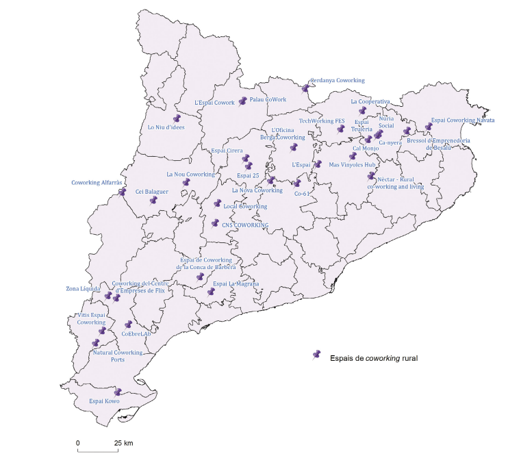 La dispersió de la població en el medi rural determina més inconvenients a l’hora de tirar endavant iniciatives empresarials, una circumstància que s’ha fet més apressant i exigent amb la penetració de la informàtica i de les noves tecnologies de la comunicació a les empreses. Algunes institucions locals miren de cobrir les mancances amb la disposició de centres de treball que ofereixen un accés fàcil a les xarxes modernes de comunicació i alhora faciliten els intercanvis entre les empreses. Els Grups d’Acció Local del programa Leader participen en una iniciativa compartida de promoció d’espais de coworking, representats en el mapa adjunt, que es distribueixen com una mena de cinquena corona metropolitana. S’hi haurien d’afegir altres iniciatives locals, algunes amb arrels en les iniciatives anteriors de vivers d’empreses o els Centres Integrals de Telecomunicacions Avançades (CITA), creats en nombre de 14 a partir de 1992 en algunes comarques rurals. Font: Projecte de Cooperació Cowocat Rural 2021.