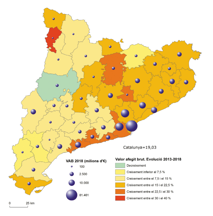 Cinc comarques metropolitanes concentren la major part del valor afegit i apareixen també entre les comarques dinàmiques. En el període de recuperació posterior a la crisi immobiliària, el creixement ha estat molt significatiu a les comarques del litoral central i, en conjunt, a la meitat oriental de Catalunya, mentre que ha estat més feble a les comarques occidentals, des de les Terres de l’Ebre fins als Pirineus, amb una excepció destacada a l’Alta Ribagorça, seguida de prop per la Vall d’Aran i la Cerdanya. Font: dades extretes de la informació estadística sobre valor afegit brut per sectors 2013 i 2018, Idescat.