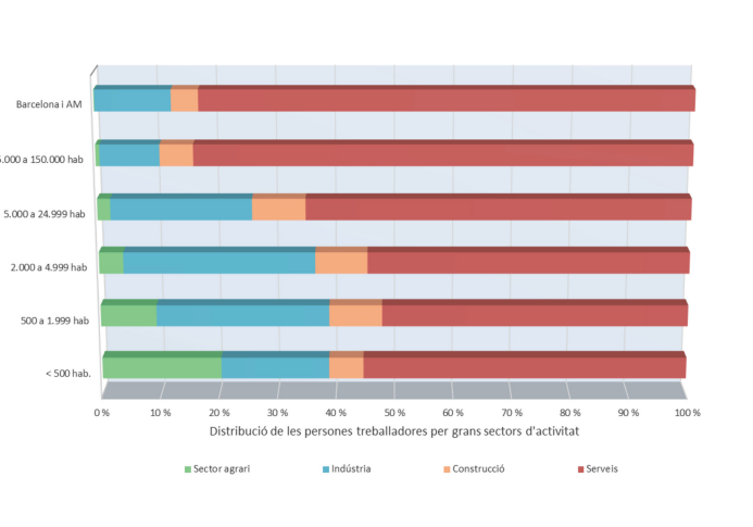 Es pot parlar del sector agrari com a tret específic de la ruralitat en el sentit que l’ocupació sectorial té encara un pes remarcable en els petits municipis rurals, força superior al pes que representa en la generació de riquesa o VAB vist anteriorment. El pes de l’activitat agrària encara és important en els municipis de menys de 500 habitants, però el sector serveis és la font d’ocupació principal en aquests mateixos municipis. El paper del sector agrari com a nínxol d’ocupació va perdent protagonisme a mesura que el municipi és més gran. Els treballadors industrials presenten la seva màxima incidència en municipis de magnitud mitjana, de manera similar al sector de la construcció. El sector serveis, majoritari arreu, té especial rellevància a les ciutats més grans i a l’àrea metropolitana, on el seu percentatge sobre el total de l’ocupació supera el 80 %. Font: Afiliats a la Seguretat Social, règim general i d’autònoms, a març de 2020, Idescat i INE.