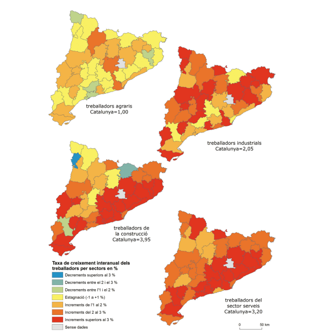 En el període de creixement previ a l’arribada de la pandèmia de la COVID-19, els grans sectors productius experimenten un augment força generalitzat de l’ocupació. Fins i tot el sector agrari n’experimenta un lleuger increment, que es localitza a les comarques d’especialització porcina i que es pot relacionar amb un augment dels assalariats del camp. L’augment es presenta particularment vigorós en el sector dels serveis, amb increments generalitzats arreu de les comarques. Mentre els serveis i la construcció creixen de manera destacada a les comarques orientals, amb excepcions a Ponent, en la indústria apareixen creixements més dispersos i localitzats a les perifèries dels centres regionals. El mateix en el sector agrari, en el qual es dibuixa la incidència positiva del sector porcí ja esmentada en la diagonal que va de la Garrotxa al Segrià. Font: Afiliacions al règim general i al règim especial de treballadors autònoms. Per sectors d’activitat. A últim dia del mes, Idescat i INE. (*) Les dades de la comarca de nova creació del Moianès (que figura en gris en alguns mapes) es reparteixen entre les comarques d’adscripció anterior dels seus municipis en les dates anteriors a la seva creació.