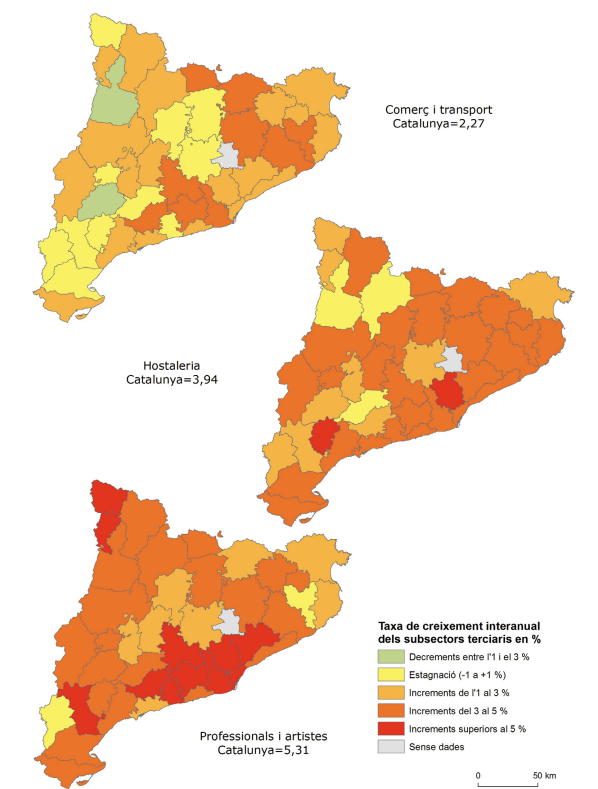 Dins dels serveis, el més dinàmic és el subsector dels professionals i artistes, que representa, però, una part reduïda de l’ocupació del sector. Darrere seu, l’hostaleria presenta un creixement també força positiu i alhora repartit pel conjunt de comarques. El grup ben nodrit del comerç i el transport presenta, en canvi, un creixement reduït o fins i tot decreixement en algunes comarques interiors. Font: Afiliació al règim general de la Seguretat Social, mineria del carbó i RETA, per secció d’activitat econòmica del compte de cotització (CCAE-2009), Observatori del Treball i Model Productiu. (*) “Comerç i transport” comprèn comerç a l’engròs i al detall i transport i emmagatzematge. “Professionals i artistes” inclou informació i comunicacions, activitats professionals i tècniques, les artístiques i d’entreteniment.