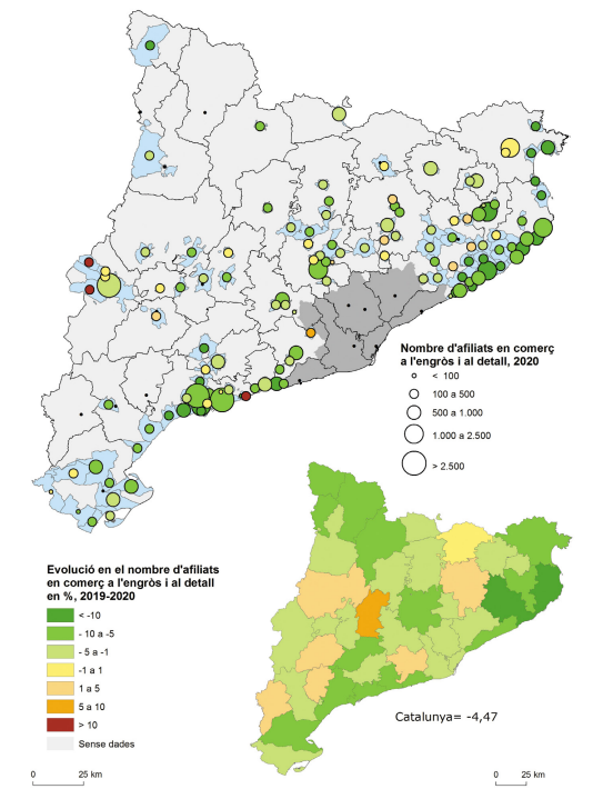 Ens encarem més aviat a la desaparició del petit comerç local i, darrere, el d’oficines i serveis veïns. Una perspectiva ben negativa, perquè sense uns centres mitjanament dinàmics, a banda de la desertització dels seus nuclis històrics, tot l’entramat de pobles i masies de l’entorn rural veuen afectats els seus serveis i llocs de treball i tindran un incentiu més a l’abandonament. Durant la pandèmia, les restriccions de la mobilitat van comportar una aturada en el procés de concentració del comerç i els serveis cap als centres més grans, fet que ha quedat reflectit en l’estancament de la majoria de centres situats en la Catalunya interior i entorns rurals, mentre que els centres situats en entorns turístics patien especialment les dificultats del sector. Podem dubtar que es mantinguin aquestes condicions favorables en tornar a la mobilitat del 2019, al contrari de les compres per Internet, en què la pandèmia ha accentuat una tendència que ja era implícita en els hàbits de consum dominants entre les generacions més joves. Font: Afiliació al règim general de la Seguretat Social, mineria del carbó i RETA, per secció d’activitat econòmica del compte de cotització (CCAE-2009), Observatori del Treball i Model Productiu. S’han cartografiat aquells municipis de més magnitud demogràfica, per als quals es desglossa la informació corresponent a aquest subsector.