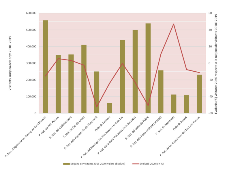 Gràfic 4.2. L’atracció dels espais naturals. Freqüentació dels parcs naturals, mitjana 2018-2019 i evolució 2020