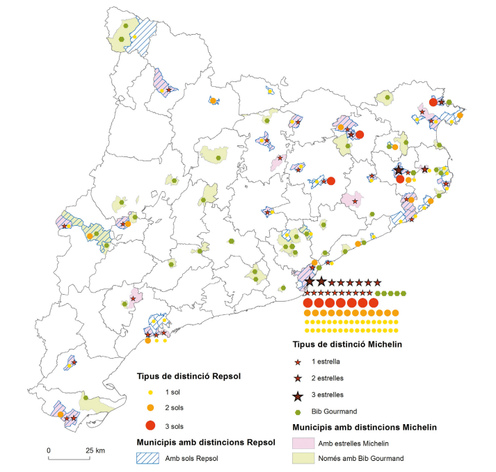 La Guia Michelin no es pot considerar el compendi màxim de l’oferta gastronòmica, però serveix com a mínim per destacar l’atractiu de visitants que pot representar la gastronomia en si mateixa. S’hi aprecia la forta concentració de distincions a la ciutat de Barcelona, que compta amb 2 dels 3 restaurants amb la qualificació màxima de tres estrelles, 6 dels 9 restaurants amb dues estrelles i 10 dels 27 restaurants amb una estrella, a més de 5 dels 44 restaurants amb distincions Bib Gourmand. En el mateix sentit, el reconeixement de restaurants de la Guia Repsol distingeix els que considera millors restaurants amb els seus “sols”. Amb la categoria màxima de tres sols, trobem a Catalunya 11 restaurants, 25 amb dos sols i 62 amb un sol. Tot i que la distribució territorial, especialment entre les comarques rurals, dels restaurants amb distincions ha millorat en els darrers anys, els reconeixements es mantenen en l’escala baixa de la gran cuina catalana, amb la gran visibilitat centrada en la ciutat de Barcelona, seguida d’una important presència dispersa entre les comarques gironines. Font: elaboració pròpia a partir de la informació actualitzada de la Guia Michelin, extreta del web oficial https://guide. michelin.com. S’hi incorporen els 49 restaurants amb distinció d’estrella Michelin i els 44 restaurants amb distinció Bib Gourmand, per a restaurants considerats amb una excel·lent relació qualitat-preu, reconeguda com l’antesala dels futurs restaurants amb estrella Michelin. La informació sobre el Sol Repsol, amb 98 restaurants a Catalunya, s’ha extret del web https://www.guiarepsol.com/