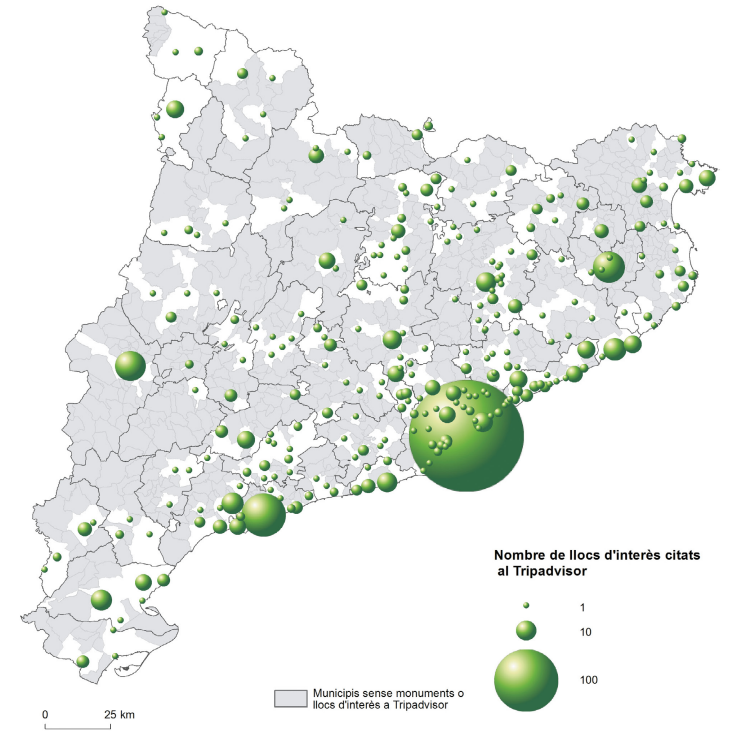 Tripadvisor és un dels buscadors més utilitzats a l’hora de cercar informació i valorar diferents destinacions que mereixen un desplaçament o un viatge, de manera que ens dona un retrat ben interessant dels espais naturals, museus, monuments i llocs diversos que susciten l’interès dels internautes, entre els quals queden particularment al marge les àrees interiors del país. Noti’s la gran concentració d’elements a Barcelona i, en menor mesura, a la zona costanera, amb àmplies zones rurals que resten fora d’aquesta forma privada de donar visibilitat als atractius territorials. En un marc on la decisió de les activitats d’oci cada cop està més influenciada per la informació present a les xarxes socials, tant o més que no pas en campanyes públiques de difusió, el desconeixement de la major part dels municipis rurals no és un fet menor. Font: elaboració pròpia a partir de les dades del servidor Tripadvisor (www.tripadvisor.es), relatives a monuments i punts d’interès, recollides el dia 20 de març del 2017. Els municipis sense monuments o llocs d’interès surten representats en gris.