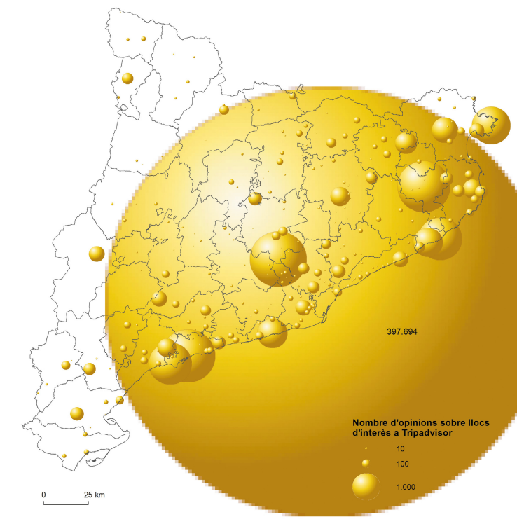 No solament apareix una concentració menor de llocs d’interès a les àrees rurals, sinó que el nombre d’opinions enregistrades per aquests llocs interiors resulta particularment minsa, per no dir insignificant. D’entrada, el nombre d’opinions manifestades sobre els punts d’interès del municipi de Barcelona resulta tan imponent que l’esfera es menja el conjunt dels altres llocs. Després, trobarem, per ordre d’interès, els punts relativament tòpics de Cadaqués, Figueres-Museu Dalí, Girona, Tossa de Mar, Sitges, Tarragona i Salou-Port Aventura, tots en zona costanera. A l’interior, només Monistrol-Montserrat resulta comparable amb les destinacions anteriors. Molt per davall quedaran Besalú, Vic, la Seu d’Urgell, la vall de Boí, Lleida, Súria, Poblet o Tortosa. Font: elaboració pròpia a partir de les dades del servidor Tripadvisor (www.tripadvisor.es), relatives a monuments i punts d’interès, recollides el dia 20 de març del 2017. Les opinions emeses a la data de referència es podien considerar poc condicionades per campanyes instrumentalitzades.