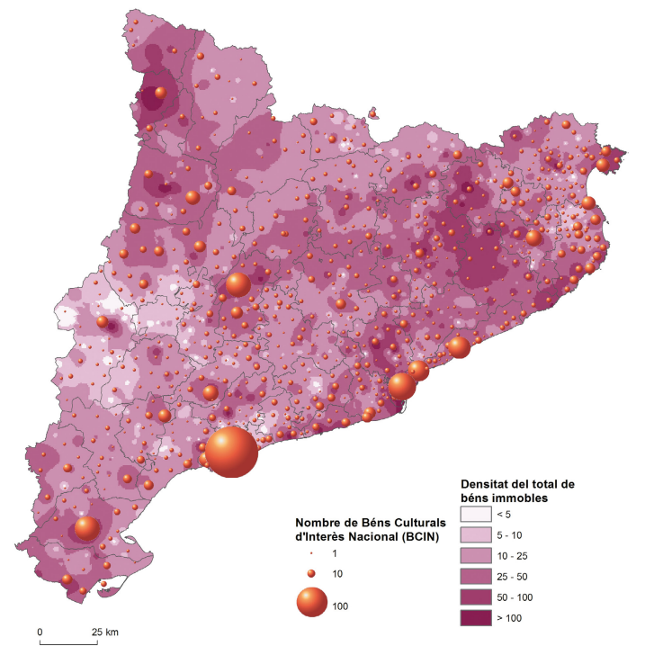 La història ha deixat enrere un ric patrimoni cultural, que s’escampa arreu del territori i té un enorme interès per a les àrees rurals, tant per la satisfacció dels propis habitants com per l’atracció de visitants forans. Es pot apreciar que, si bé el nombre de béns amb el grau més elevat de protecció, els declarats com a Bé Cultural d’Interès Nacional (BCIN), es concentren en nuclis urbans, el volum d’elements patrimonials catalogats és important en algunes zones rurals de Catalunya, sobretot a les zones pirinenques i prepirinenques. El fet que el grau de reconeixement i protecció sigui menor en zones rurals pot ser causat per la manca de serveis tècnics o de capacitat dels mateixos ajuntament rurals, amb dificultats per reconèixer, mantenir i promocionar el seu ric patrimoni. Font: elaboració pròpia a partir de la base de dades de l’Inventari de Gestió Integral del Patrimoni Cultural Immoble (EGIPCI), del Departament de Cultura, que conté inventaris sobre el patrimoni arquitectònic, arqueològic i paleontològic de Catalunya. Es cartografien dues informacions complementàries, el nombre de BCIN de cada municipi a través d’esferes proporcionals i el total de béns immobles inventariats per municipi, independentment del nivell de protecció a través de la densitat.