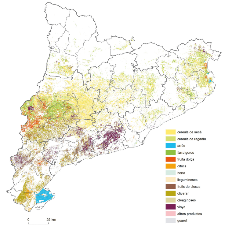 L’agricultura ocupa les grans planes i altiplans del país, entre les quals destaquen clarament les grans planes interiors ponentines, que representen unes 325.000 hectàrees de conreus, gairebé la meitat de regadiu, que es dedica a la producció de fruita dolça, panís i alfals, un marc de cultius molt semblant al que trobem a l’Empordà. Olivera, vinya, ametllers, avellaners i altres fruites seques les trobem a les planes litorals, i des d’aquestes s’escampen cap a l’interior, a les comarques meridionals. L’horticultura i la vinya donen, en qualsevol cas, un valor estratègic especial a l’agricultura de les planes litorals i veïnes. Els cereals de secà s’escampen pels altiplans interiors i la part nord-oriental, en consonància amb unes condicions climàtiques que s’allunyen de la bonança mediterrània i s’apropen a les de l’Europa temperada. Per altra banda, a l’altre extrem climàtic, els arrossars i cítrics donen una singularitat al delta de l’Ebre i terres veïnes. Font: elaboració pròpia a partir del mapa de cultius (DUN) de Catalunya 2020 del Departament d’Acció Climàtica, Alimentació i Agenda Rural.