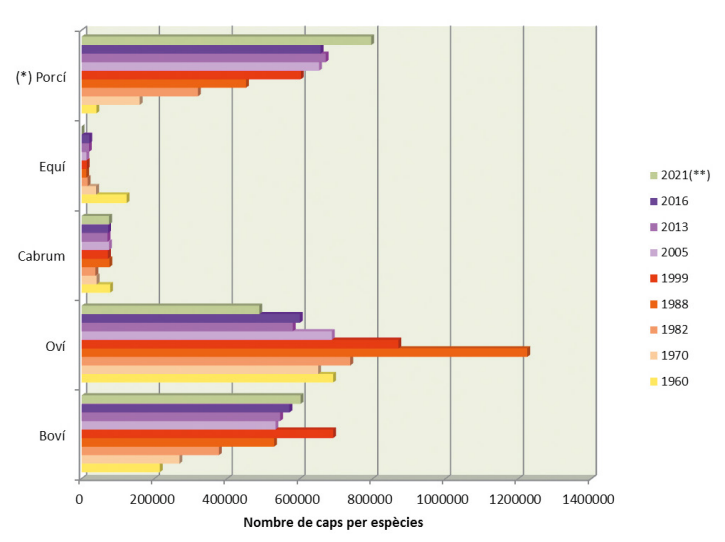 El gràfic posa de relleu les grans tendències dels darrers anys, en les quals destaca l’augment continuat fins fa poc temps i l’estabilització posterior de la cabanya porcina, que és el pilar central de la ramaderia i de gairebé tot el sector agrari, amb més de 6,5 milions de caps. Tot i l’empenta del darrer quinquenni, sembla que aquest sector ha arribat al seu límit productiu per causes diverses (tancament de mercats, problemàtica de les dejeccions ramaderes i altres). En la resta de sectors ramaders, constatem, enmig de salts conjunturals importants, una persistència en la davallada del nombre de caps d’oví i una recuperació tendencial del boví. No s’hi inclouen les dades productives de l’aviram o la cunicultura, que presenten dificultats específiques de comptabilització i dubtes de fiabilitat, per bé que xifres i mercats apunten cap al manteniment de la tendència recessiva d’aquest tipus de bestiar. Font: Censos ramaders realitzats per les administracions agràries competents de cada moment. (*) El nombre de porcs ha estat dividit per 10 per poder situar-lo al costat de les altres espècies ramaderes. (**) Les dades del 2021 corresponen al cens de bestiar realitzat pel Departament d’Acció Climàtica, Alimentació i Agenda Rural.