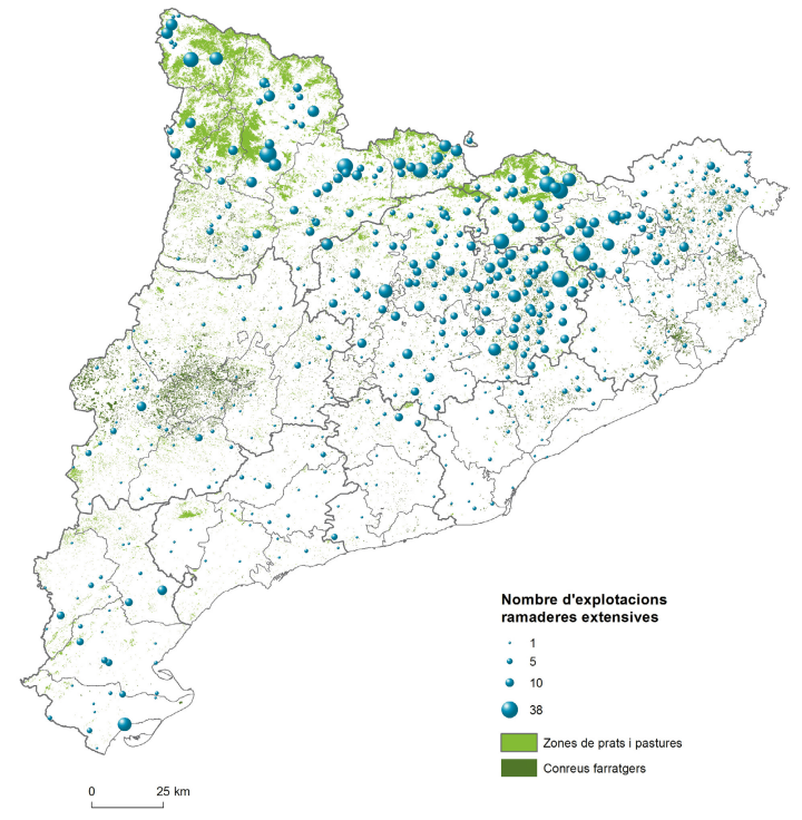 S’entén per ramaderia extensiva la que recorre en bona part a la pastura per a l’alimentació del bestiar. No és la més habitual, però és de gran interès en el sentit de l’aprofitament dels recursos farratgers, que es generen sovint de manera natural i representen un sistema d’explotació en recessió en els darrers anys. S’aprecia clarament la concentració del sector de la ramaderia extensiva al nord i nord-est del país, en zones de muntanya amb abundància de precipitacions i presència de pastures naturals. La ramaderia bovina ha guanyat pes entre el bestiar extensiu, entre el qual es manté l’oví i el cavallí, a més de cabres en ramats aïllats o amb ramat oví. Font: elaboració pròpia a partir del mapa d’usos i cobertes de sòl de Catalunya 2017, del Departament de la Vicepresidència i de Polítiques Digitals i Territori, i Registre d’explotacions ramaderes 2021, del Departament d’Acció Climàtica, Alimentació i Agenda Rural. S’ha representat la zona de prats de pastura i el nombre d’explotacions ramaderes extensives per municipi. Es consideren explotacions extensives quan els animals no estan allotjats ni són alimentats dins d’instal·lacions de manera permanent, i s’alimenten principalment de pastures a l’estiu i de farratge a l’hivern.