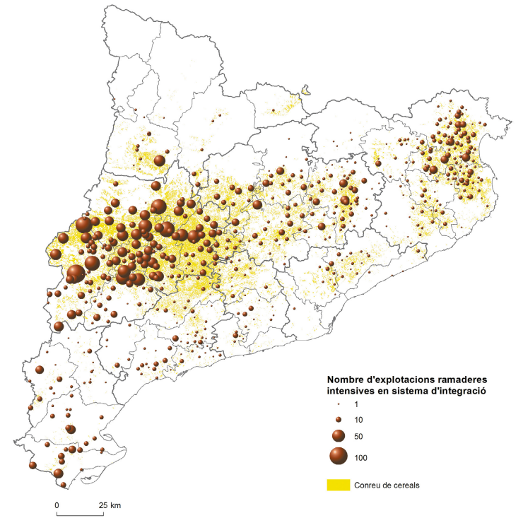 En contrast amb el mapa precedent es representa la ramaderia intensiva fonamentada en l’engreix estabulat a base de pinso. Les explotacions ramaderes que s’hi dediquen han de suportar fluctuacions de capital molt elevades, tant en bestiar com en aliment, que han fet que la gran majoria acabessin en un sistema d’integració amb les empreses del pinso. En aquestes explotacions integrades el ramader és propietari de la granja i gestiona l’engreix, però els animals, el pinso i els medicaments els hi posa l’industrial, sota la seva responsabilitat directa. La ramaderia intensiva integrada coincideix fonamentalment amb la zona de producció porcina del país, l’eix transversal Lleida-Vic-Girona, que té al darrere també una tradició de producció de grans, com ho mostra l’abundant superfície del conreu de cereals. Font: elaboració pròpia a partir del mapa de cultius (DUN) de Catalunya 2020 i Registre d’explotacions ramaderes 2021 del Departament d’Acció Climàtica, Alimentació i Agenda Rural. Els animals en sistema intensiu estan allotjats i són alimentats dins d’instal·lacions de manera permanent.