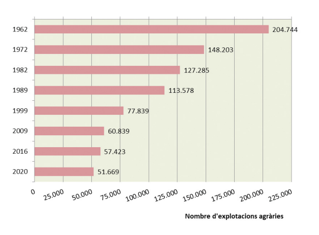 El procés d’industrialització i concentració de la producció que tingué lloc principalment a finals de segle XX i principis de l’actual ha comportat una pèrdua extraordinària del nombre d’explotacions agràries, en paral·lel a un descens dels actius o ocupats en el sector. Actualment hi ha aproximadament una quarta part de les explotacions agràries que se censaven l’any 1962, i la davallada és continuada. En paral·lel, es produeix un augment de la dimensió productiva de les explotacions, tant en terra conreada com en nombre d’animals criats, i una reconfiguració també de la seva estructura cap a una estructura empresarial. En aquest sentit, les explotacions amb una titularitat jurídica sumen un 12,5 % de les explotacions, però abasten un 28 % de la terra de conreu i creixen any rere any. Font: Cens agrari per als anys 1962-2009 i Enquesta d’estructures agràries per al 2016, recollida per Idescat. (*) Durant el 2022 potser es publicaran les dades del Cens agrari del 2020, que hauran d’actualitzar la informació anterior. La xifra recollida s’ha obtingut a partir d’extrapolar la dada paral·lela més aproximada, representada per les explotacions que recull la DUN, que representen una xifra lleugerament inferior (47.940 el 2020).