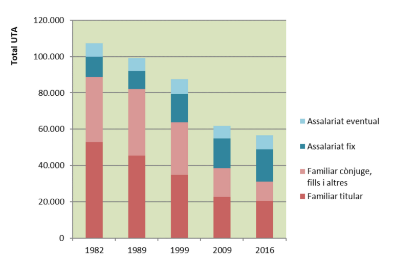 El volum de l’ocupació agrària mesurada en unitats de treball anual (UTA) s’aproxima al del total de les explotacions i experimenta una evolució similar. En els darrers vint-i-cinc anys, la pèrdua de llocs de treball del sector se suavitza, però continua la tendència a la baixa. En conjunt, es produeix una reestructuració de la mà d’obra tant o més important per les seves repercussions, amb una disminució del volum de la força de treball familiar i un augment de la força de treball assalariada, que es concentren en la mà d’obra dels titulars d’explotació i la dels assalariats fixos. És un signe evident de la reconversió empresarial de l’explotació familiar, mentre el nombre d’explotacions continua davallant. Font: Cens agrari i Enquesta d’estructures agràries, recollida per l’Idescat. Durant el 2022 potser es publicaran les dades del Cens agrari del 2020, que hauran d’actualitzar la informació anterior. Una unitat de treball anual (UTA) es correspon amb la dedicació plena d’una persona durant un any a l’explotació (mínim 228 jornades a partir del 1999), i una persona no pot realitzar més d’una UTA. Altrament, es comptabilitzen fraccions d’UTA.
