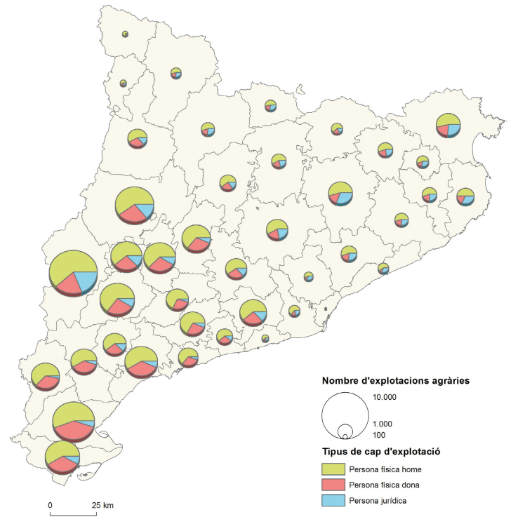 El pes de les comarques de Lleida i de les Terres de l’Ebre sobre el conjunt en el nombre d’explotacions agràries és clarament majoritari (57 % de les explotacions). Més incidència hi té encara el paper preponderant de les explotacions familiars el cap de les quals és un home, que arriben a gairebé el 60 % de Catalunya. El paper de la dona com a cap d’explotació, per bé que està en creixement, és encara minoritari (27 %). Trobem els valors més elevats, d’entre el 35 i el 40 % d’explotacions dirigides per dones, a les Terres de l’Ebre. Les explotacions sota fórmula de persona jurídica són minoritàries (12 %), però el seu pes puja substancialment quan se’n quantifica la superfície conreada o el valor produït. En comarques com el Vallès Occidental, el Baix Empordà, Osona i el Maresme suposen més del 30 % de les explotacions. Font: elaboració pròpia a partir de l’estadística d’Explotacions agrícoles de Catalunya, a partir de les dades declarades a la DUN 2021. Donat que la base de dades no inclou la comarca del Moianès, s’ha optat pel mapa de comarques anterior a la seva desagregació. (https://analisi.transparenciacatalunya.cat/)