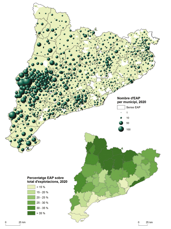 Les explotacions agràries prioritàries (EAP) corresponen a aquelles que presenten al capdavant agricultors professionals que viuen de manera expressa de l’activitat a la pròpia explotació i tenen un reconeixement particular en les polítiques públiques de suport. Tal com en l’observació del total de les explotacions, les dades mostren clarament la concentració dels pagesos i pageses al capdavant d’una EAP a l’oest del país, principalment al Segrià, com a principal zona agrària productiva de Catalunya. Per altra banda, curiosament, allí on les explotacions agràries prioritàries tenen un pes relatiu superior és a les comarques pirinenques, on la davallada de les explotacions ha estat particularment important i queden més aviat aquelles que tenen una dedicació expressa en el sector. Font: elaboració pròpia a partir de l’estadística d’explotacions agrícoles (DUN) de Catalunya. La localització de l’explotació deriva de la residència del titular, sigui una persona física o jurídica, no pas en la ubicació de l’explotació. Moltes explotacions, de fet, compten amb terrenys en diferents municipis.