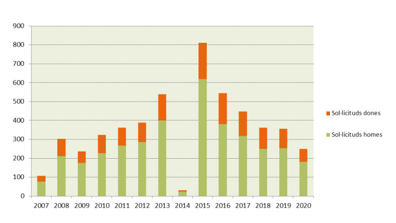 Deixant de banda l’excepcionalitat de la caiguda del 2014, deguda a circumstàncies burocràtiques del canvi de període del Pla de desenvolupament rural, les sol·licituds d’ajuts per a la incorporació d’agricultors joves que es tramiten presenta dues tendències ben contraposades d’evolució, amb una caiguda que segueix el fort creixement dels anys de crisi, com si la incorporació de joves al camp anés a l’inrevés de la conjuntura econòmica. Sobre el nombre sol·licituds presentades i comptabilitzades al gràfic, un 7,4 % no acaben tirant endavant, principalment per renúncies o desistiments (4,5 %) o denegacions (2,9 %). Per la seva banda, les sol·licituds de dones joves representen entre un 22 i un 32 % anual, i una mitjana per al període situada en el 27,8 %, amb oscil·lacions erràtiques que deixen entreveure en la dinàmica a llarg termini un cert augment de la presència femenina respecte a etapes anteriors, encara que les xifres queden lluny de la paritat entre sexes. Font: elaboració pròpia a partir de dades del Departament d’Acció Climàtica, Alimentació i Agenda Rural. Observatori de Joves. (https://observatoridejoves.cat/)