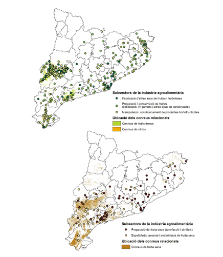 La indústria relacionada amb les produccions de fruita i verdures es troba a prop dels punts de conreu. S’aprecia una gran concentració de la indústria agroalimentària hortofructícola a l’entorn del Segrià i Pla d’Urgell i altres concentracions a l’Empordà i a les Terres de l’Ebre, aquí amb un pes específic important dels cítrics, i també a l’Empordà, el Baix Llobregat i zones del Camp de Tarragona, amb bona producció de verdures o fruites. Menor pes territorial té l’agroindústria de la fruita seca, que manté com a principal focus d’activitat l’entorn de Reus, àrea amb una gran tradició i clarament destacada d’altres àrees productores de fruites seques que no han desenvolupat una indústria transformadora específica. Font: Registre d’Indústries Agràries i Alimentàries del Departament d’Acció Climàtica, Alimentació i Agenda Rural i del mapa d’usos i cobertes de sòl de Catalunya 2017, del Departament de la Vicepresidència i de Polítiques Digitals i Territori. No hi ha descriptor que discrimini les indústries del segment dels cítrics de la resta del sector hortofructícola; per això s’ha optat per representar conjuntament les dades de la fruita dolça i les dels cítrics.