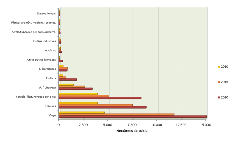 Gràfic 5.14. Evolució de les hectàrees de producció ecològica dels principals conreus, 2010-2020