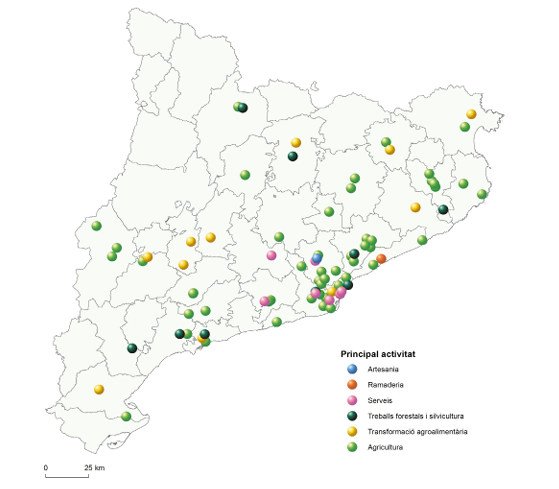 La calma pròpia de les àrees rurals, el contacte amb la natura o les virtuts dels treball manual poden tenir un interès per si mateixos més enllà de la rendibilitat de la mateixa activitat agrària. A partir d’aquí, han aparegut un seguit d’iniciatives que conjuminen les activitats productives relacionades amb la cadena agroalimentària i l’atenció a col·lectius de persones en risc d’exclusió social. En funció de la focalització més productiva o més sanitària, apareixen diferents perfils d’empreses que es consideren part del paraigüa comú del que a les primeries del segle s’anomena agricultura social. D’acord amb els col·lectius implicats, les entitats tenen una ubicació fonamentalment metropolitana o urbana, però això no n’exclou les possibilitats d’implantació en entorns més rurals. Les seves activitats acostumen a representar, en qualsevol cas, un exemple de sensibilitat social, cap al medi i cap a les produccions agrícoles artesanes i de qualitat. Font: les dades del mapa provenen del mapa col·laboratiu desenvolupat per l’Equip de Recerca en Agricultura Social del Departament de Geografia de la Universitat Autònoma de Barcelona (https://agriculturasocialcat.wordpress.com).