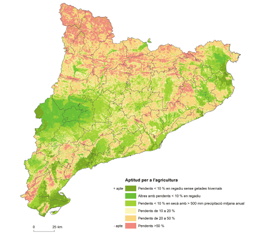Catalunya és un país muntanyenc amb una enorme extensió de la urbanització i de nous projectes constructius i d’infraestructures que obliguen a vetllar per la disponibilitat de sòls per a l’ús agrari. L’aptitud dels sòls per al cultiu ha passat a formar part dels indicadors que serveixen per regular les noves implantacions d’elements construïts i determinats usos en el sòl no urbanitzable. En el mapa es reconeix el valor de les grans planes del país com el capital fonamental de l’agricultura catalana, paper recolzat sovint amb la presència del regadiu. Tanmateix, hi ha una gran diversitat a escala local i un gran contrast entre punts relativament reduïts i propers a l’hora de determinar l’aptitud física d’un determinat indret. Altrament, la composició del plànol parcel·lari constitueix un element determinant del desenvolupament agrari sobre el qual es fa difícil d’intervenir i fer-ne una valoració. Font: elaboració pròpia a partir de les bases cartogràfiques del SIGPAC i l’Atles climàtic de Catalunya. (*) Informació de base treballada en àmbit de parcel·la, fet que dificulta la interpretació de la gradació de colors a l’escala d’impressió representada. La tipologia s’ha establert a partir dels camps que expliciten el tipus de conreu, el pendent mitjà de la parcel·la i el percentatge de superfície regada.