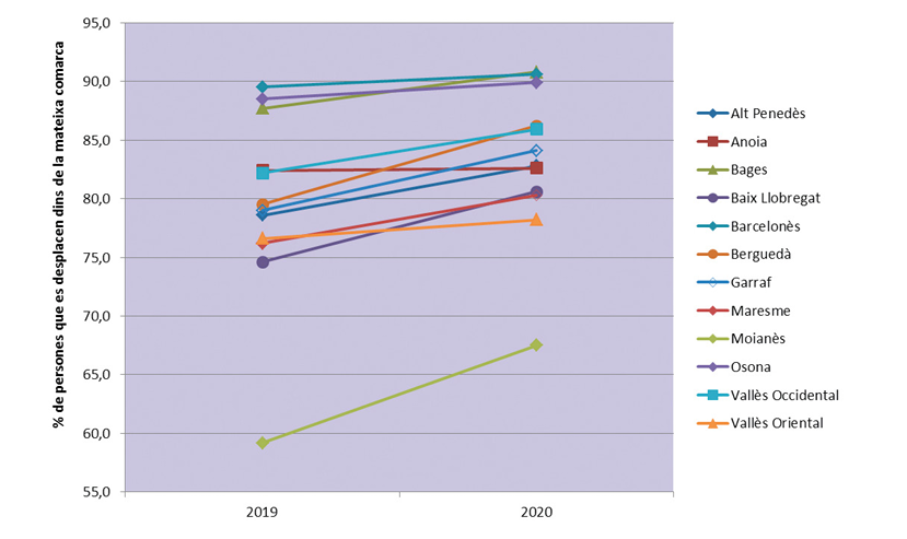 La població fa al voltant de quatre desplaçaments en dies feiners, que responen a diferents motius, entre els quals destaquen els desplaçaments obligats per motius de treball, seguits amb un pes similar pels que es produeixen per fer compres o acompanyar familiars o amics, i una mica més enrere els que tenen una finalitat de passeig sense motiu específic. Les visites al metge, gestions personals i altres diverses justificacions tenen un pes més reduït. Amb la crisi de la COVID, ha augmentat la mobilitat per motius de passeig i de compra i ha disminuït la resta de mobilitat, cosa que ha repercutit en l’evolució negativa de la mobilitat general, que afecta particularment la població de més edat i els joves. Tal com mostra el gràfic, l’estructura urbana del territori determina la direcció dels desplaçaments, així com les seves característiques i la durada. Tot i la limitació de les dades, podem deduir que les comarques que configuren una àrea de mercat coherent en el seu interior i tenen una bona dotació de serveis i activitats, generalment per la presència de centres d’atracció importants, presenten uns desplaçaments cap a l’exterior de la seva àrea menors. Resulta curiosa, altrament, la dependència exterior del Moianès, una comarca rural fortament atreta per part de la metròpoli. Font: L’impacte de la COVID-19 en la mobilitat quotidiana, Institut d’Estudis Regionals i Metropolitans de Barcelona, maig 2021 (https://doc. atm.cat/).