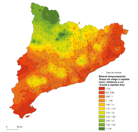 En comparar les distàncies reals per carretera amb les distàncies a vol d’ocell (distàncies en línia recta), se’ns dibuixen les zones avantatjades o penalitzades des del punt de vista del temps d’accés a partir de la xarxa viària existent. Es pot deduir, doncs, que la xarxa de les àrees més desafavorides té unes pitjors condicions de disseny (velocitat de disseny de la infraestructura, traçat, interseccions…), circumstància que pot respondre a diferents motius, des de la planificació viària fins a les dificultats de la mateixa orografia. Així, trobem, per exemple, que les zones orogràficament més accidentades, com és el cas dels municipis pirinencs i de certes zones de les serralades prelitorals, són les que presenten més costos de temps per distància, un desavantatge que pesarà notablement sobre el desenvolupament general d’aquestes àrees. Font: elaboració pròpia a partir de dades de temps de viatge entre els caps de municipi de Catalunya respecte a totes les capitals comarcals i els centres urbans transfronterers més pròxims, extretes del portal de mobilitat de la Generalitat de Catalunya (http://mobilitat.gencat.cat/). (*) S’ha procedit a sumar tots els temps de viatge respecte a cada capital comarcal i diversos centres urbans transfronterers per tenir un valor d’accessibilitat general, expressat en total de minuts de viatge. S’ha procedit a calcular també la suma de distàncies reals en quilòmetres a vol d’ocell de cada cap de municipi respecte a les mateixes capitals comarcals i centres urbans transfronterers. S’ha dividit les dues sumes per obtenir una dada de cost de viatge per quilòmetre recorregut, o relació temporal-espacial dels diferents municipis catalans.