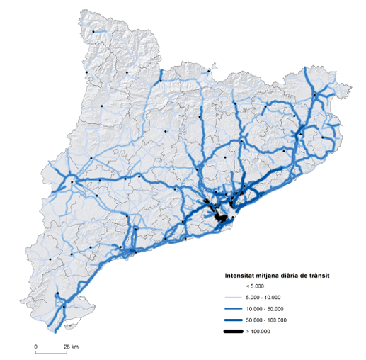 Res posa millor en evidència l’estructura humana de les relacions a l’interior del territori, i el pes de les ciutats en l’estructuració de l’entorn i la captació de fluxos, que la intensitat del trànsit per la xarxa viària. Fins i tot en el detall de la intensitat de fluxos de la Seu d’Urgell amb Andorra i la Ribera d’Urgellet, una illa enmig del desert de fluxos que es presenta a la Catalunya occidental, el país rural per excel·lència. Es pot remarcar el gruix del trànsit pels eixos nord-sud pirinencs, que decauen a l’oest del Llobregat, així com el gruix dels eixos costa-interior, que decauen per davall de l’eix Tarragona-Lleida. La situació en relació amb les grans infraestructures de comunicació no és una garantia de desenvolupament, però en constitueix una bona base. Font: elaboració pròpia a partir de la base d’intensitat de trànsit IMD 2015 del Departament de la Vicepresidència i de Polítiques Digitals i Territori.