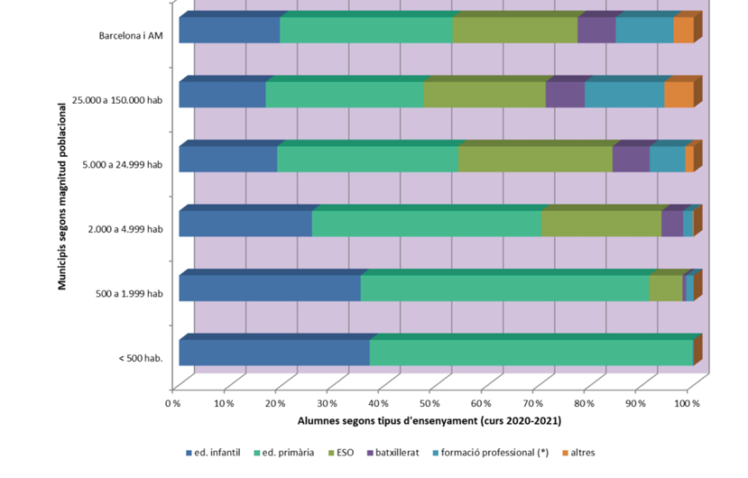 El mateix volum poblacional dels municipis marca la disponibilitat o no d’escola i l’edat a la qual els alumnes han de migrar cap a nuclis més poblats per continuar els seus estudis, fet que redunda en la dificultat de l’arrelament de les noves generacions als municipis menys poblats. Només les poblacions més grans disposen d’una oferta educativa completa i acullen, doncs, els alumnes dels diferents nivells. Font: elaboració pròpia a partir de dades del Departament d’Educació extretes del portal de Dades Obertes de la Generalitat de Catalunya (https://analisi.transparenciacatalunya.cat/). (*) No es disposa de dades d’alumnes matriculats en formació professional per al curs 2020-2021; en aquest cas, s’han emprat les dades del curs 2019-2020.