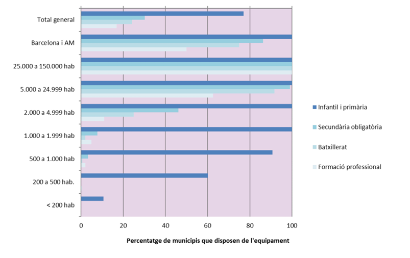 El municipi més petit de Catalunya que disposa d’escola per a alumnes d’infantil i primària és els Omells de na Gaia, que té 130 habitants empadronats, mentre que el municipi més gran que no en disposa és Massanes, amb 796 habitants. Entremig es produeixen situacions variades, amb un total de 217 municipis que no disposen d’ensenyament en infantil i primària, un fet força habitual als municipis de menys de 500 habitants. Pel que a l’educació secundària obligatòria (ESO), el municipi més petit amb institut és la Granadella, amb 716 habitants, i el nombre de municipis que no en té puja a 661, mentre que el batxillerat i la formació professional apareixen en municipis més grans. Font: elaboració pròpia a partir de dades del Departament d’Educació extretes del portal de Dades Obertes de la Generalitat de Catalunya (https://analisi.transparenciacatalunya.cat/). (*) No es disposa de dades d’alumnes matriculats en formació professional per al curs 2020-2021; en aquest cas, s’han emprat les dades del curs 2019-2020.