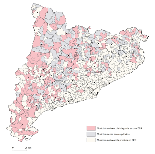 Al costat dels municipis rurals sense escola, apareixen altres municipis rurals que la mantenen. I malgrat que el nombre d’alumnes d’aquests centres no permet la separació entre els diferents cursos, l’aprenentatge rebut no mostra un dèficit particular, sinó fins i tot el contrari. Hi contribueixen notablement els especialistes, serveis i programacions compartides a través de les zones escolars rurals, o agrupacions d’escoles rurals. Font: elaboració pròpia a partir de dades del Departament d’Educació.