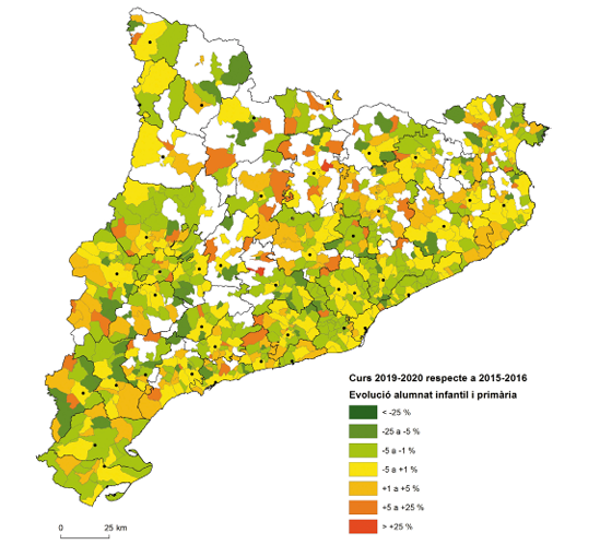 Les dades mostren, des del curs 2015-2016 fins al curs 2019-2020, una reducció de l’alumnat del 0,54 % interanual en el conjunt de Catalunya. El manteniment de les escoles rurals en un marc de reducció d’alumnes generalitzat es fa més difícil, tot i que podem veure que les escoles ubicades en municipis petits són les úniques que no presenten pèrdua d’alumnat. Font: Base de dades d’Alumnes matriculats per ensenyament i unitats dels centres docents, extretes del portal de dades obertes de la Generalitat a partir dels Sistemes d’Informació del Departament d’Educació (https://analisi.transparenciacatalunya.cat/).