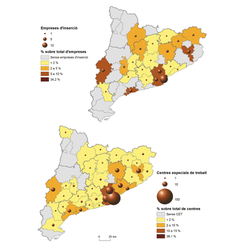 Els serveis públics d’assistència social s’estenen per totes les comarques i les poblacions grans i comprenen l’atenció domiciliària en casos de necessitat. Una altra qüestió és l’atenció dels col·lectius més necessitats, que recau en una part molt important en la iniciativa i que esdevé escassa a les comarques rurals, on les demandes de servei són també menors. Un exemple en són els centres especials de treball, que a Catalunya representen l’opció administrativa per aixoplugar les entitats que volen oferir “un treball remunerat a persones amb discapacitat, sigui física, intel·lectual o sensorial, mitjançant la seva integració sociolaboral i tenint en compte les seves necessitats específiques”. Coincideixen sovint amb les “empreses d’inserció”, denominació que senzillament es refereix a un registre específic de les empreses que els col·lectius anteriors o les persones en situació de pobresa i exclusió social. Font: Registre de Centres Especials de Treball i Registre administratiu d’empreses d’inserció de Catalunya (maig 2021). (https://treball.gencat.cat/)